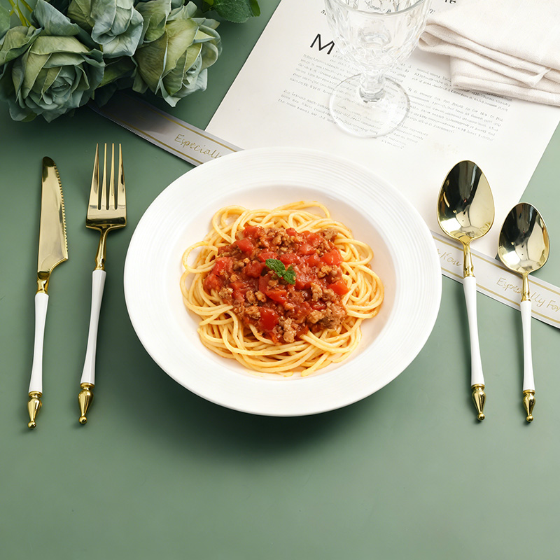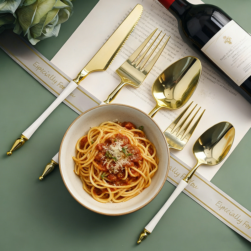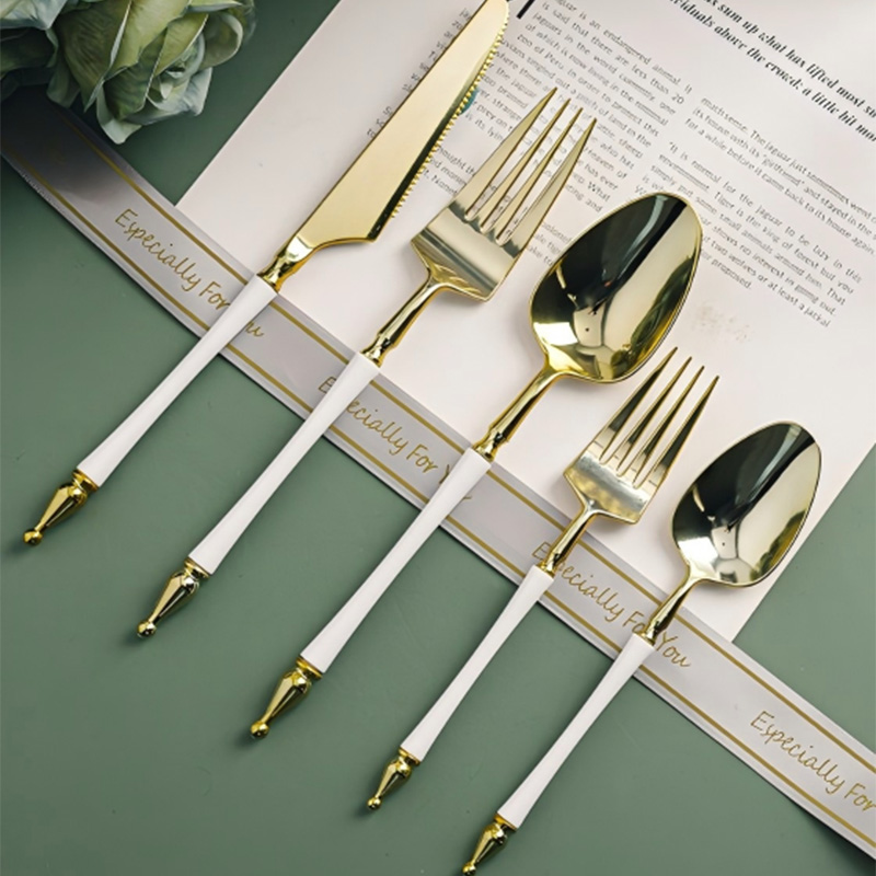 Gold head + white handleElegant Aesthetic:Features a chic two-tone design with lustrous gold-finished heads and clean white handles, adding a touch of luxury to any table setting.