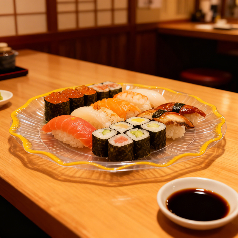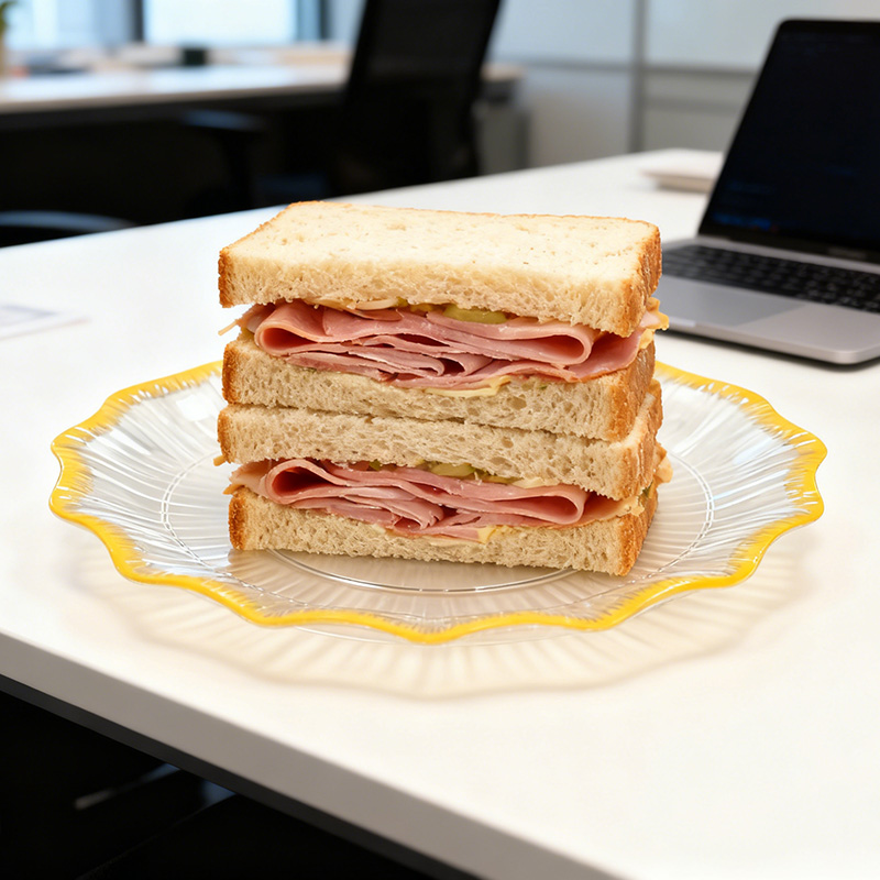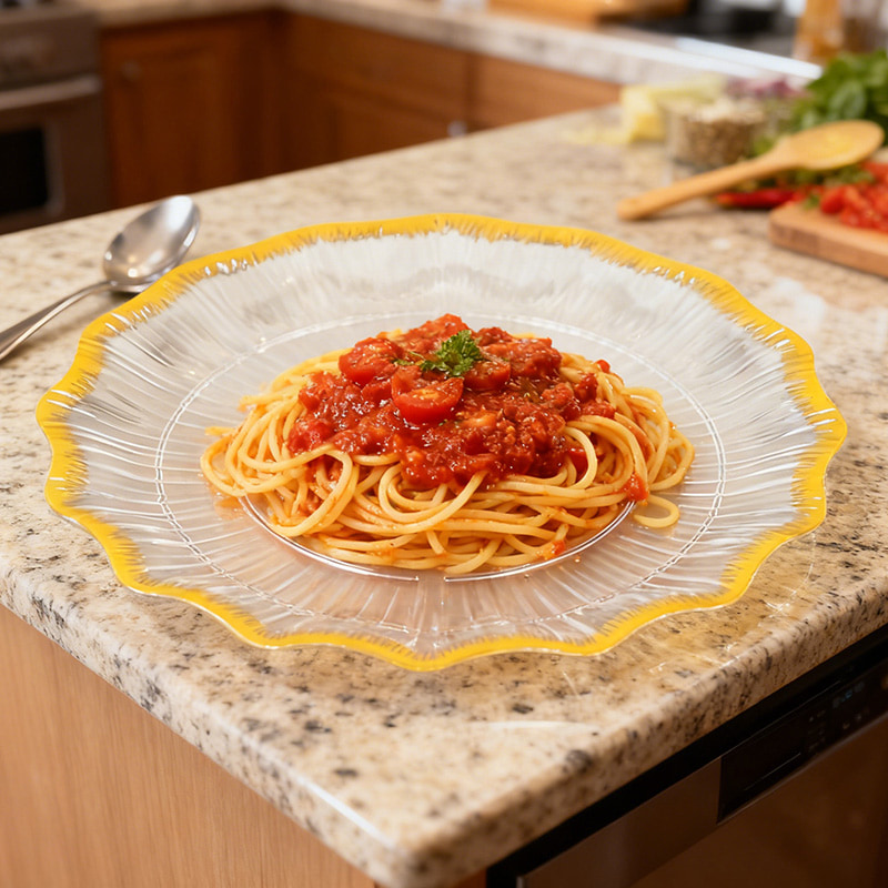 Элегантный и функциональный дизайнОтличается привлекательной текстурой в виде звездочек (обеспечивает нескользящее сцепление и преломление света для лучшей презентации блюд), кристально чистым корпусом, демонстрирующим яркие цвета продуктов, и изящной золотой окантовкой, придающей нотку роскоши и изысканности.